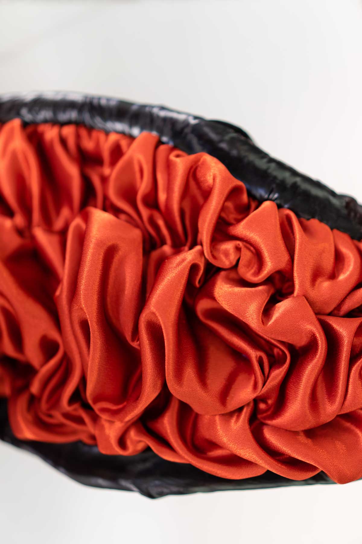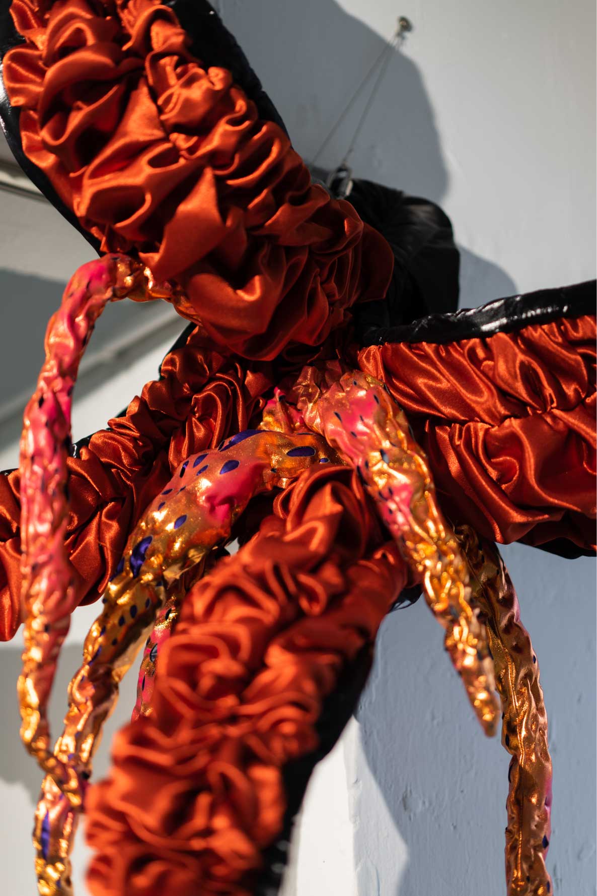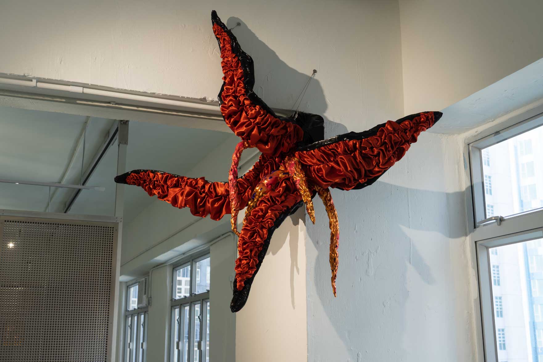The artist‘s striking Agari (2024) made of coal black and burgundy red textile resembles a large flower bud opening up its body, with four tentacle-like petals protruding to its periphery. The soft sculpture, with its title meaning ’ascent‘ or ’rise‘ in Japanese, is installed at a high-up corner yet looking down at the viewer like a surveilling, encompassing (m)Other, reminiscing the jump scare moments in the horror movies where a close-up shot of the monstrous creature jolts the viewer with its bloody crimson maw.