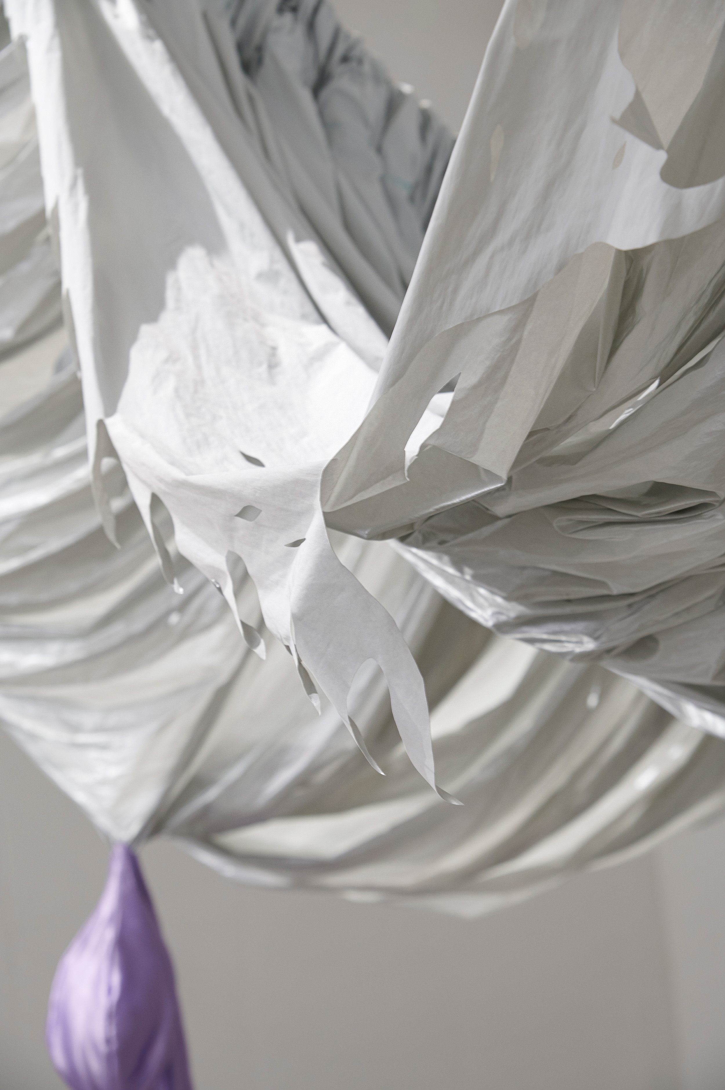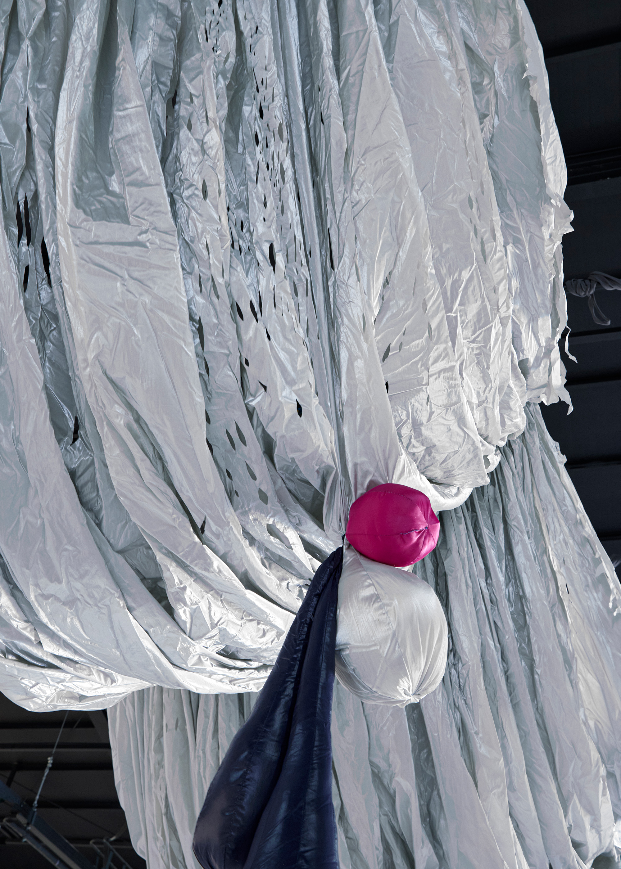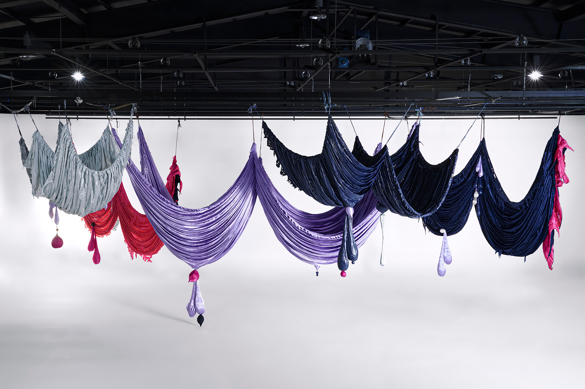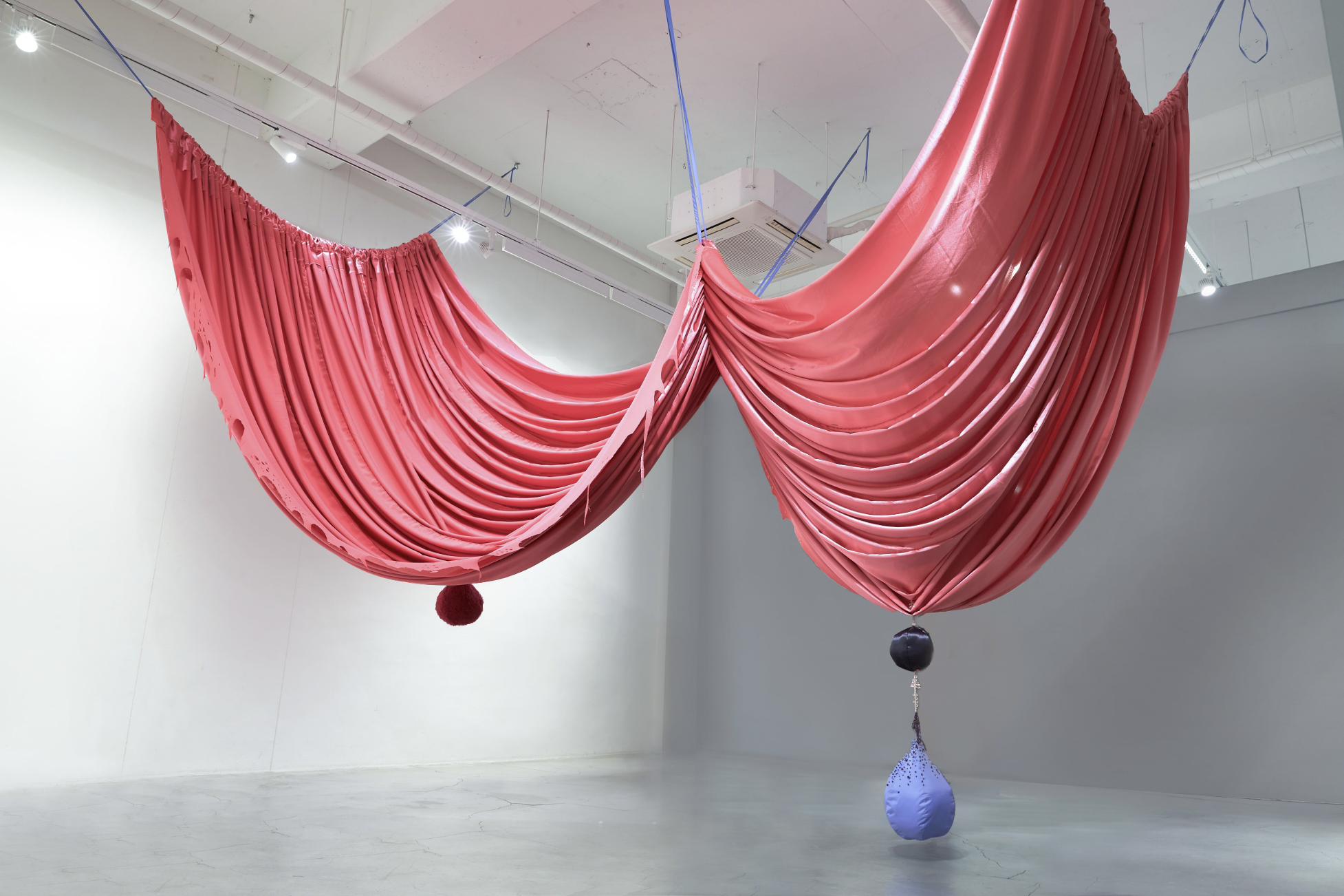 It is reminiscent of hanging curtains in a ballroom, or a bat spreading its wings in mid-air. Woo's installation embraces the inevitability of decay and rejects the conventional standard of beauty imposed on women by conceptualizing the process of ageing and the dynamic bodily transformation. Each fabric piece represents a different stage of a woman's body during breastfeeding - from the swelling of breasts in preparation, to the restful period when the milk subsides.