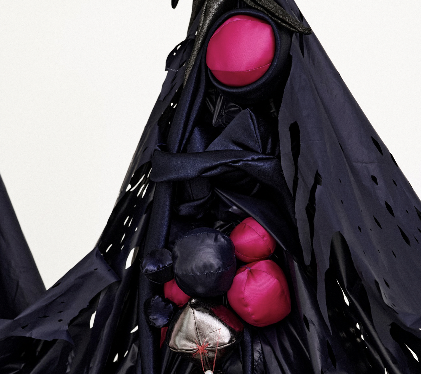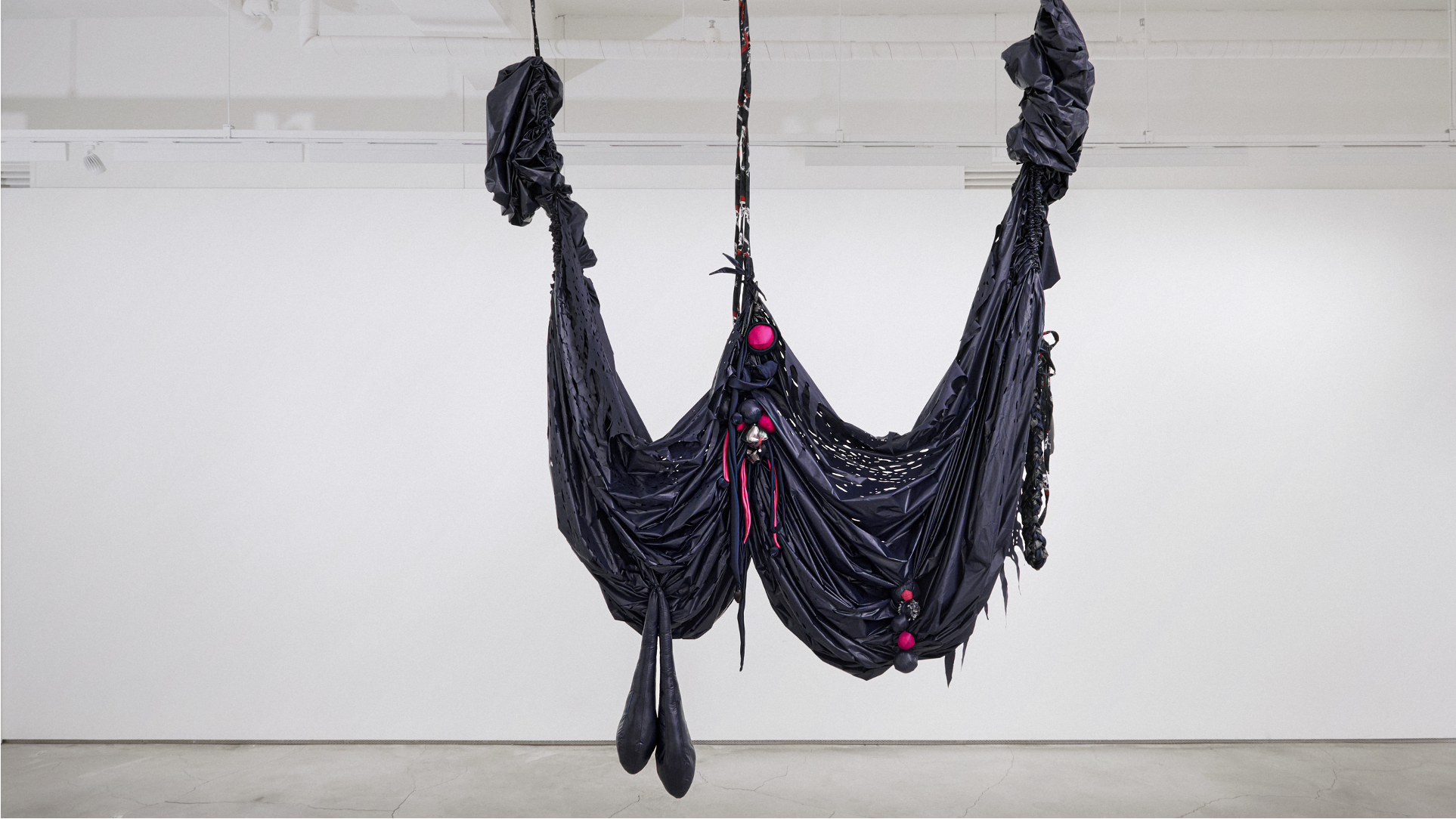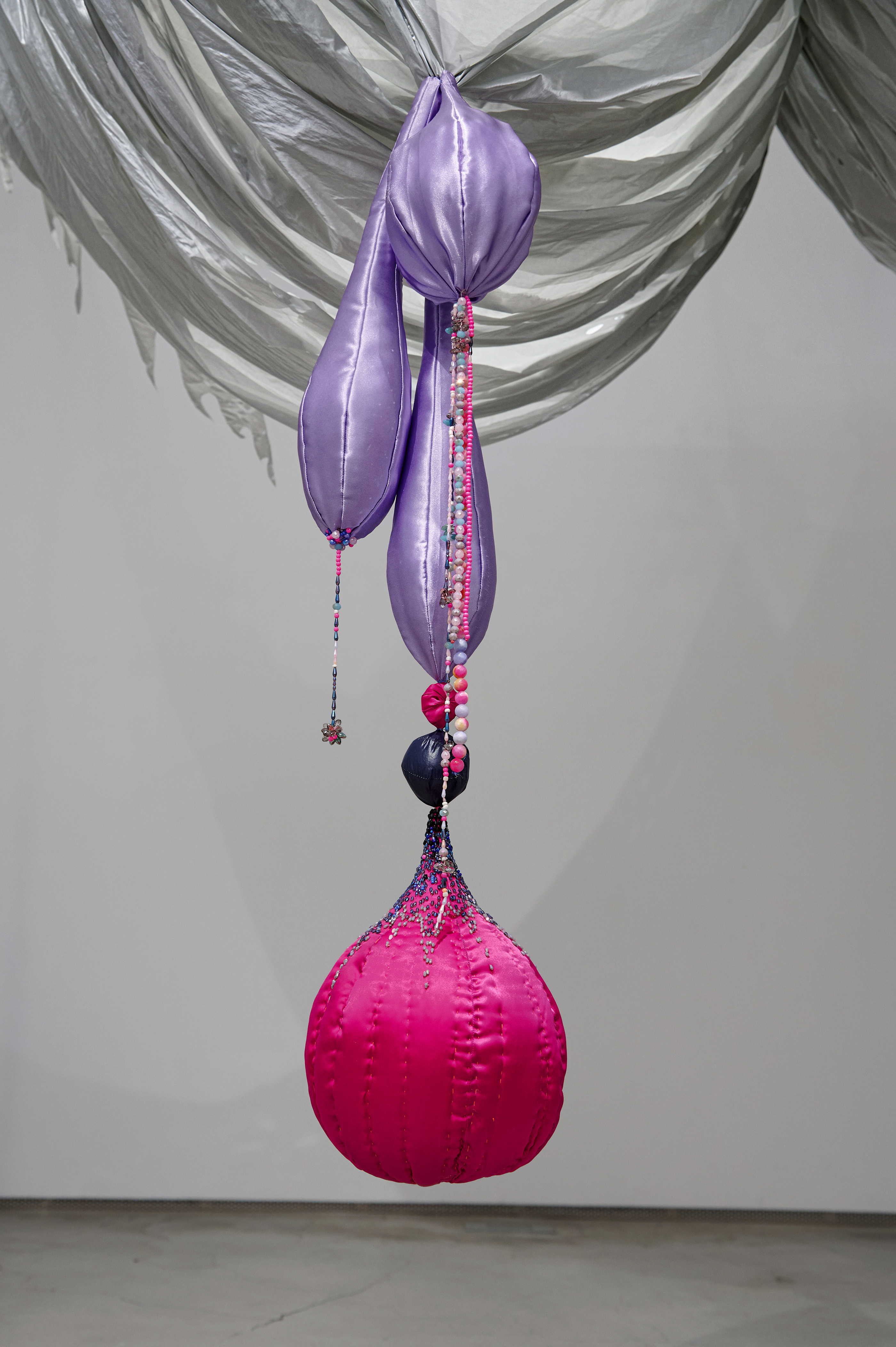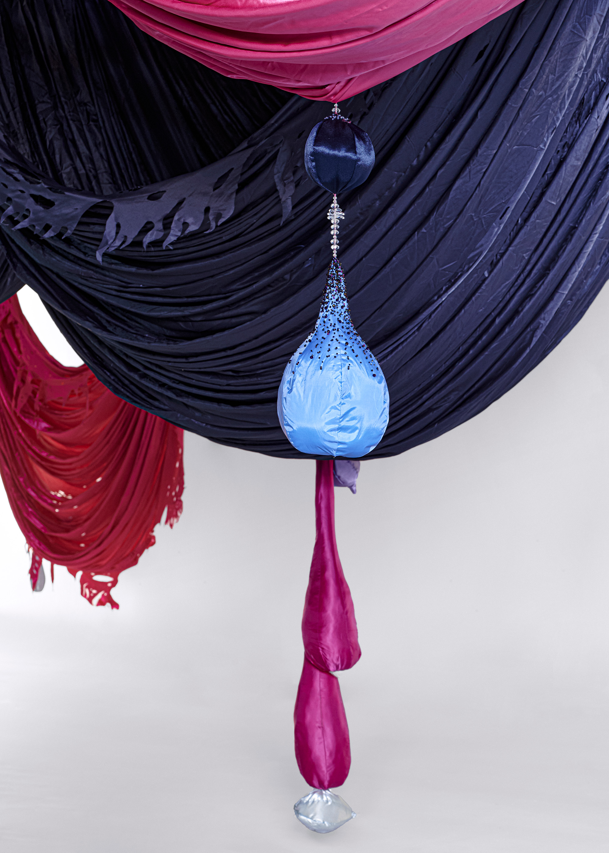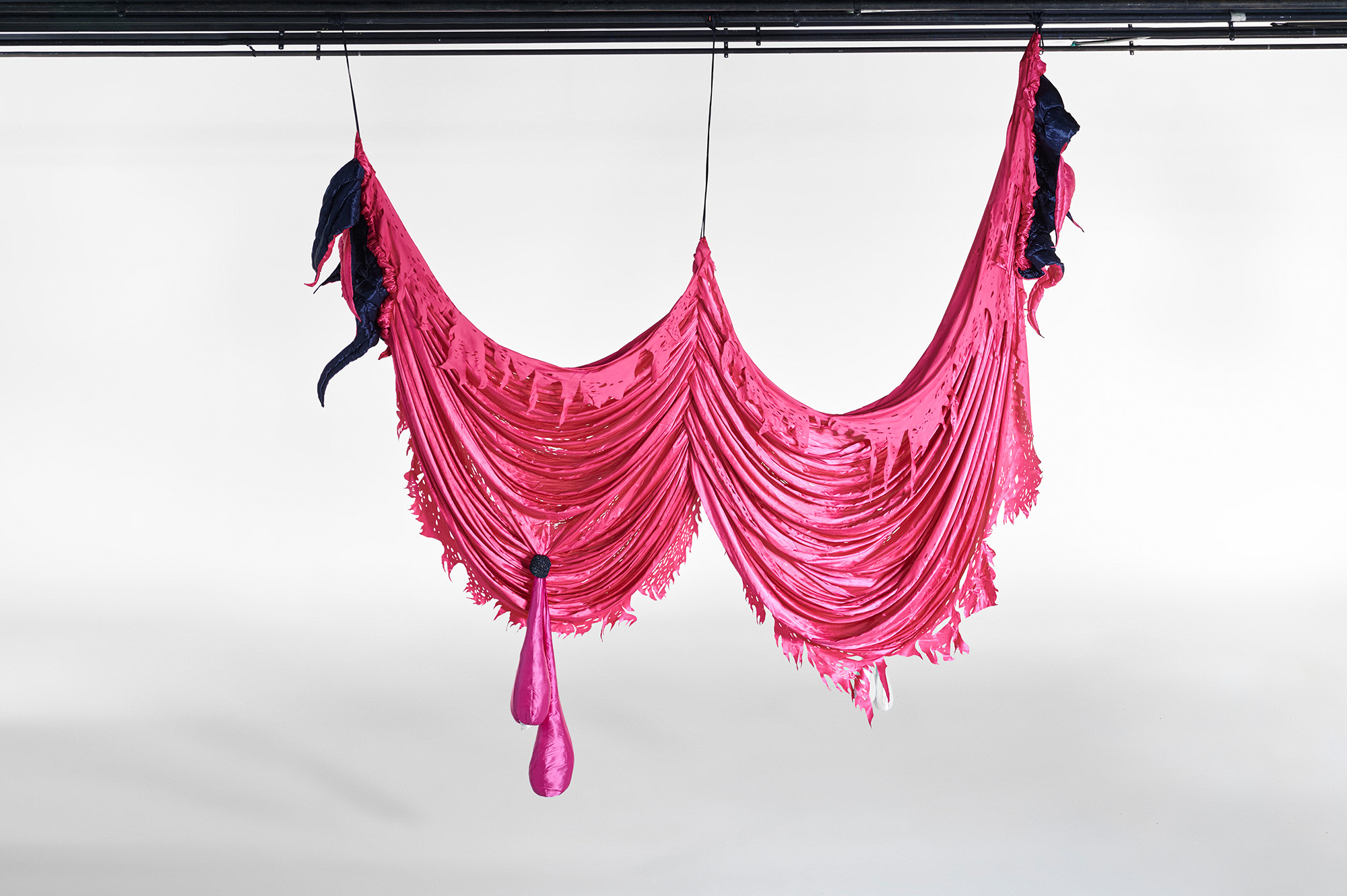 It is reminiscent of hanging curtains in a ballroom, or a bat spreading its wings in mid-air. Woo's installation embraces the inevitability of decay and rejects the conventional standard of beauty imposed on women by conceptualizing the process of ageing and the dynamic bodily transformation. Each fabric piece represents a different stage of a woman's body during breastfeeding - from the swelling of breasts in preparation, to the restful period when the milk subsides.