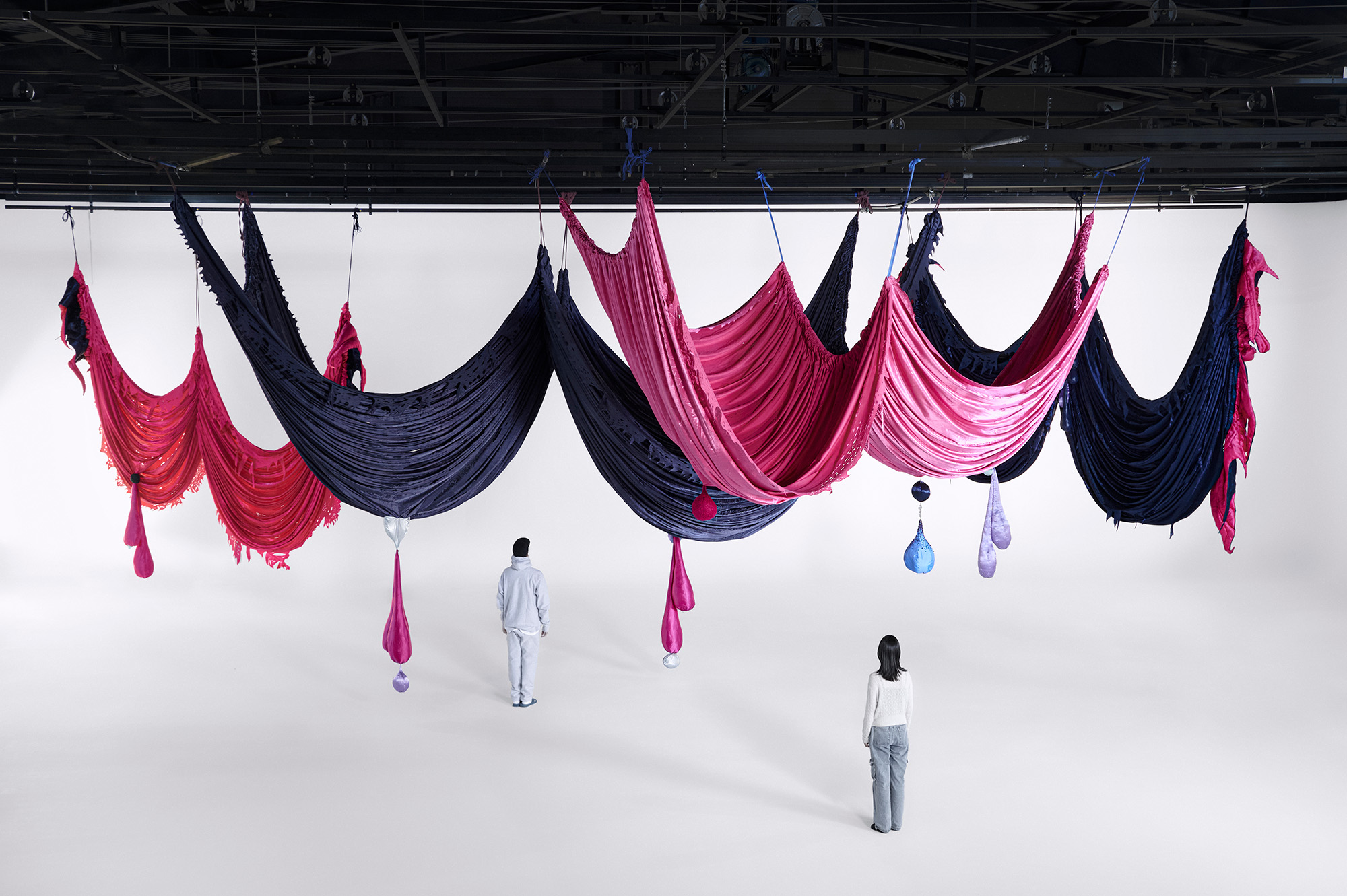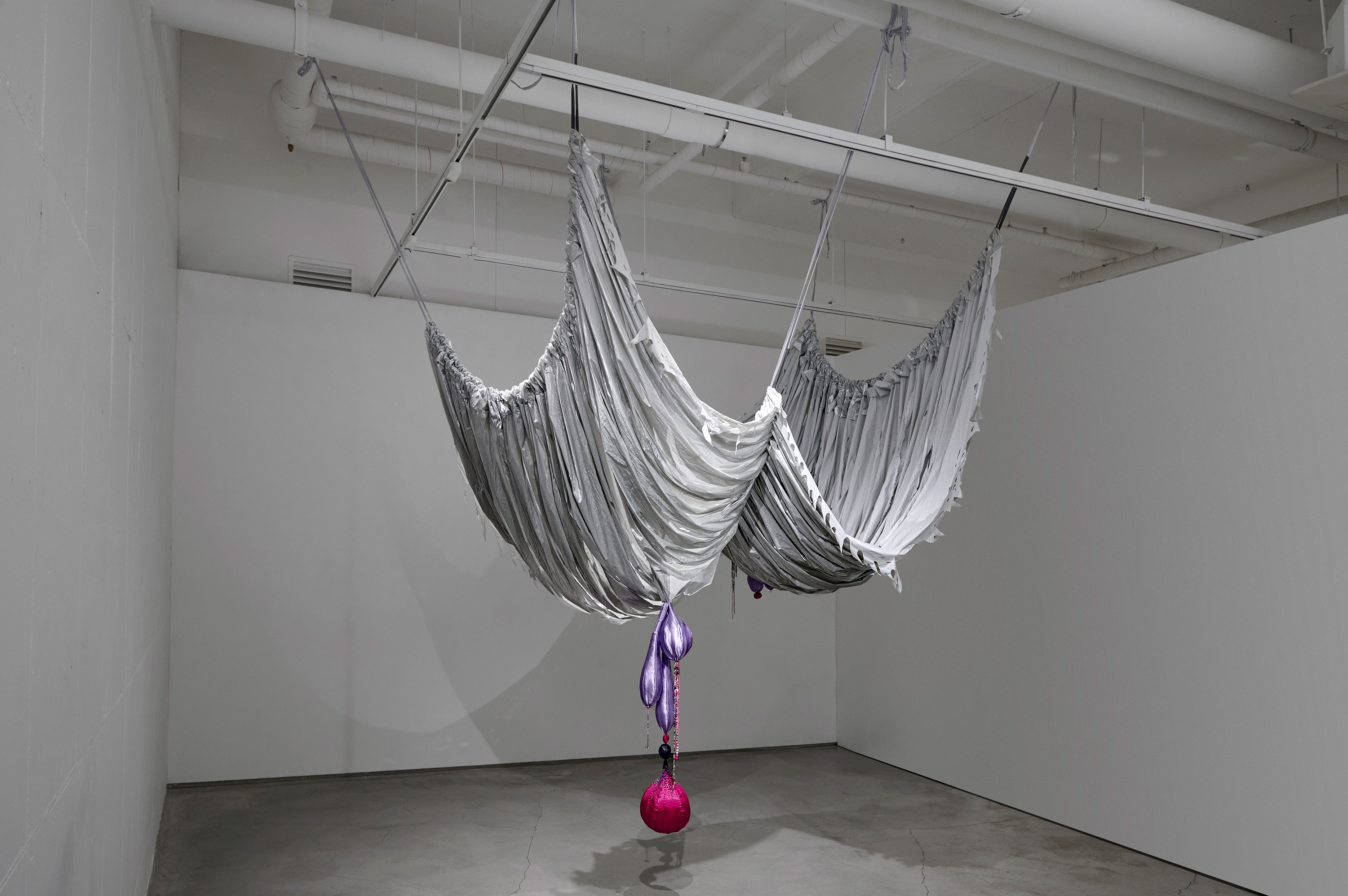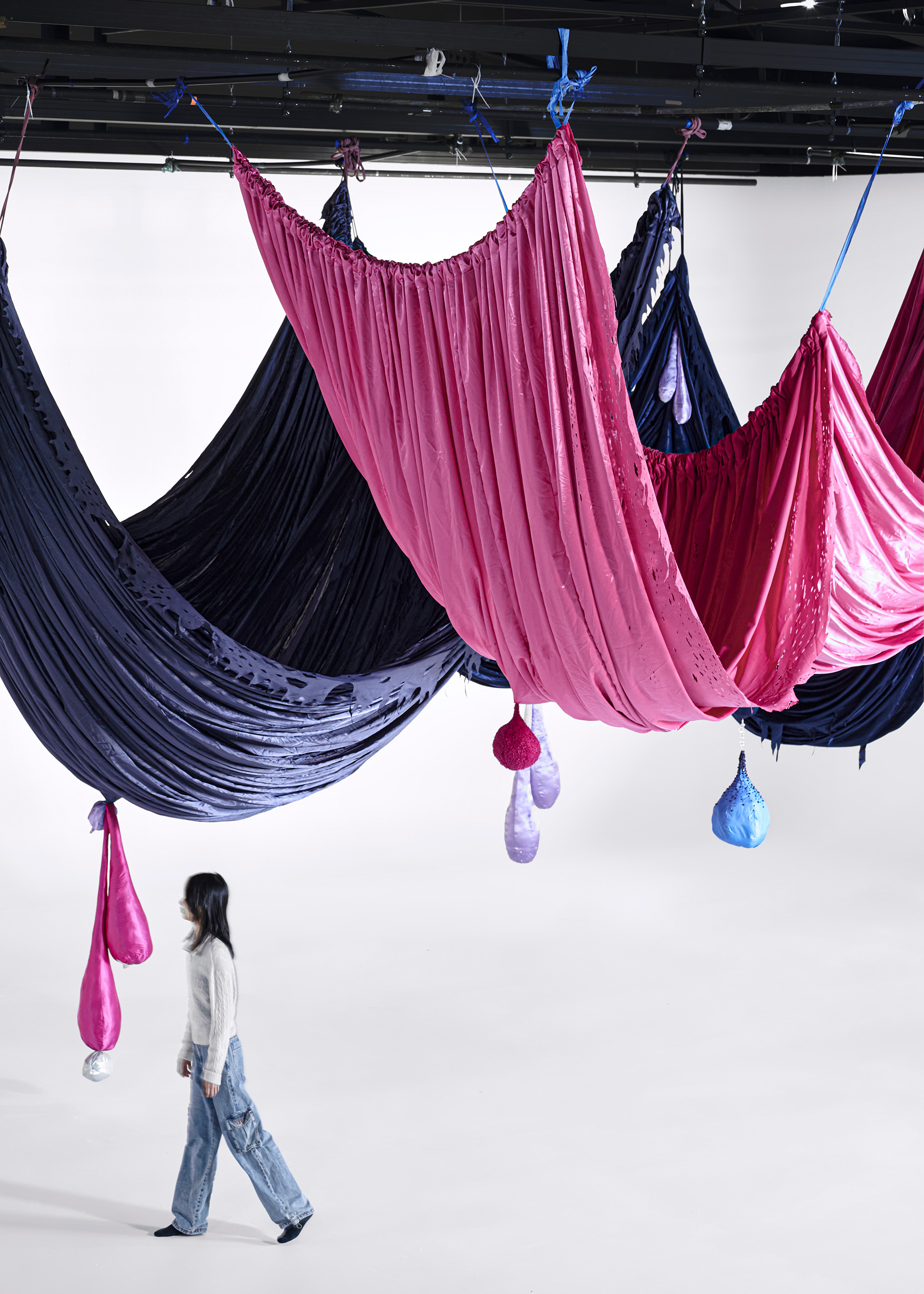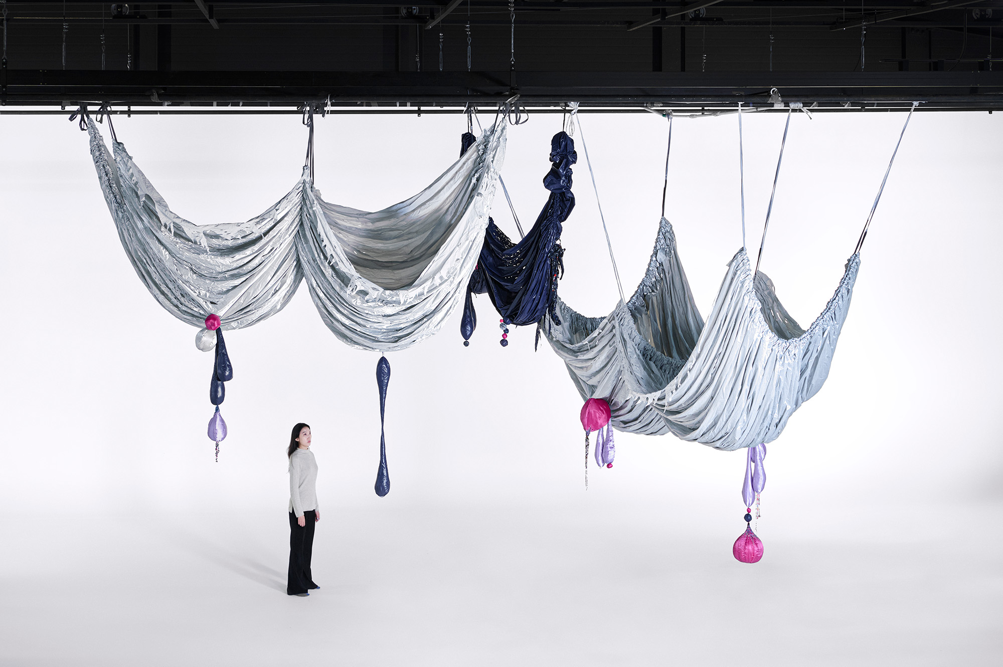 Woo's winning commission, titled The Great Ballroom (2023), is a large-scale installation that continues her series Milk and Honey (2023-ongoing). It serves as a celebratory avenue for vitality and liberation. The installation's draped fabrics accentuate the flexible nature of the fabric and bring to mind the shape of women's breasts.