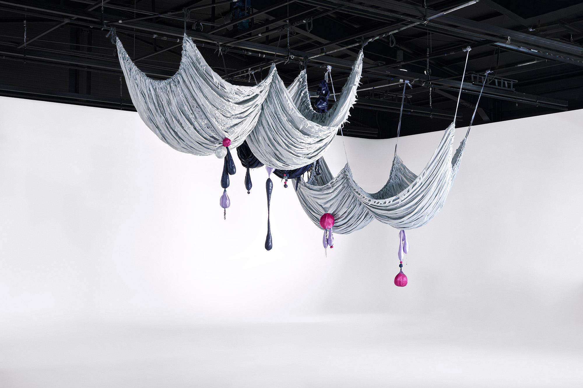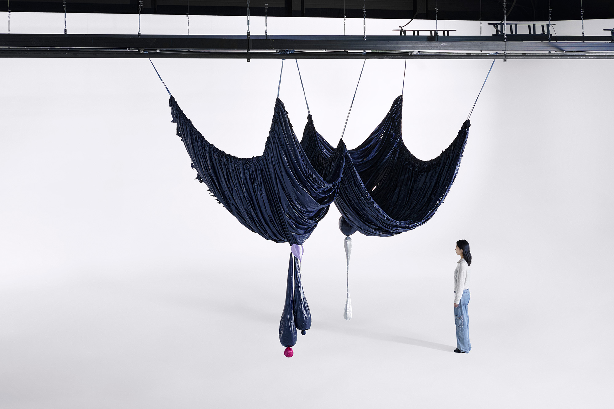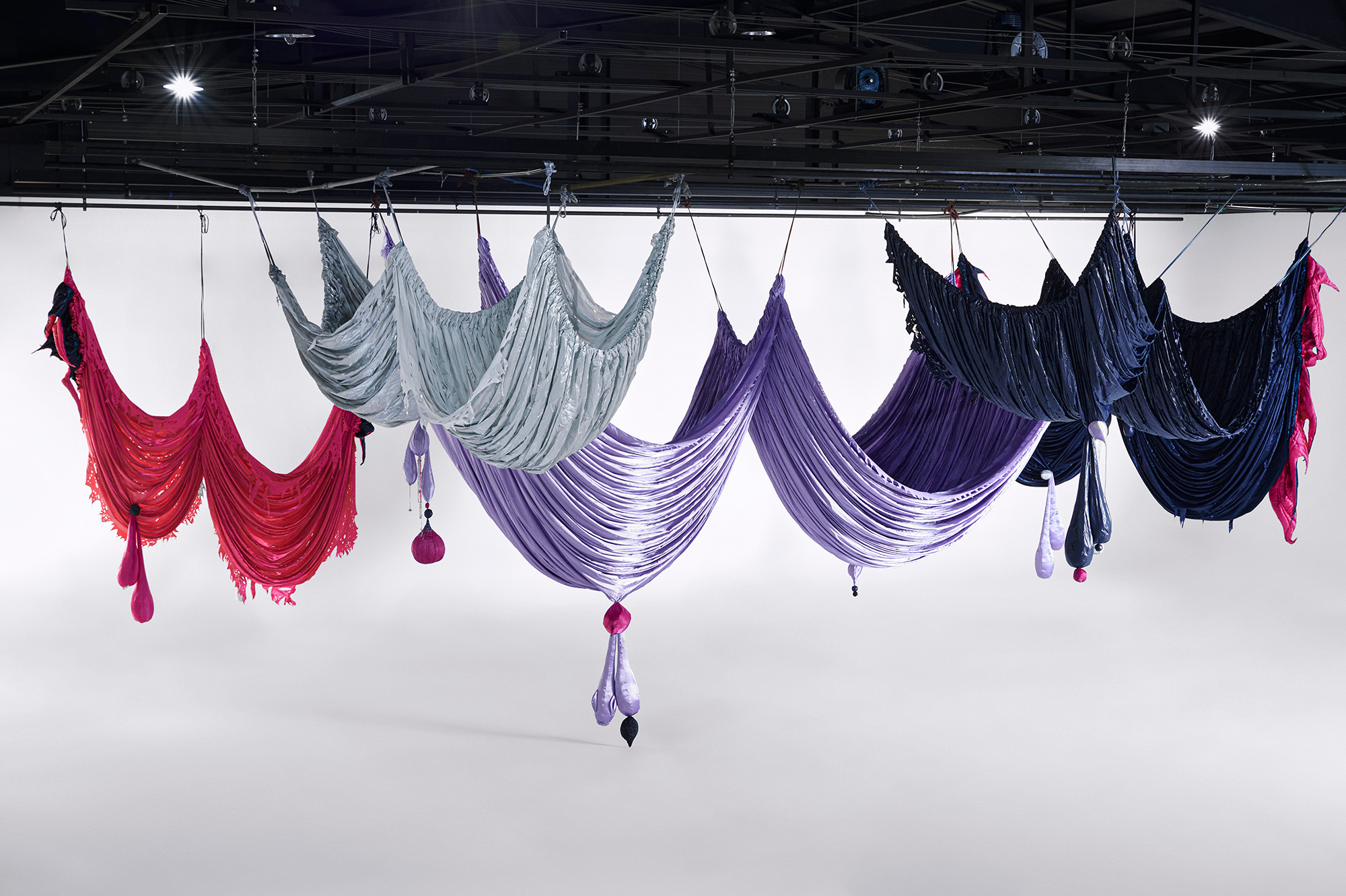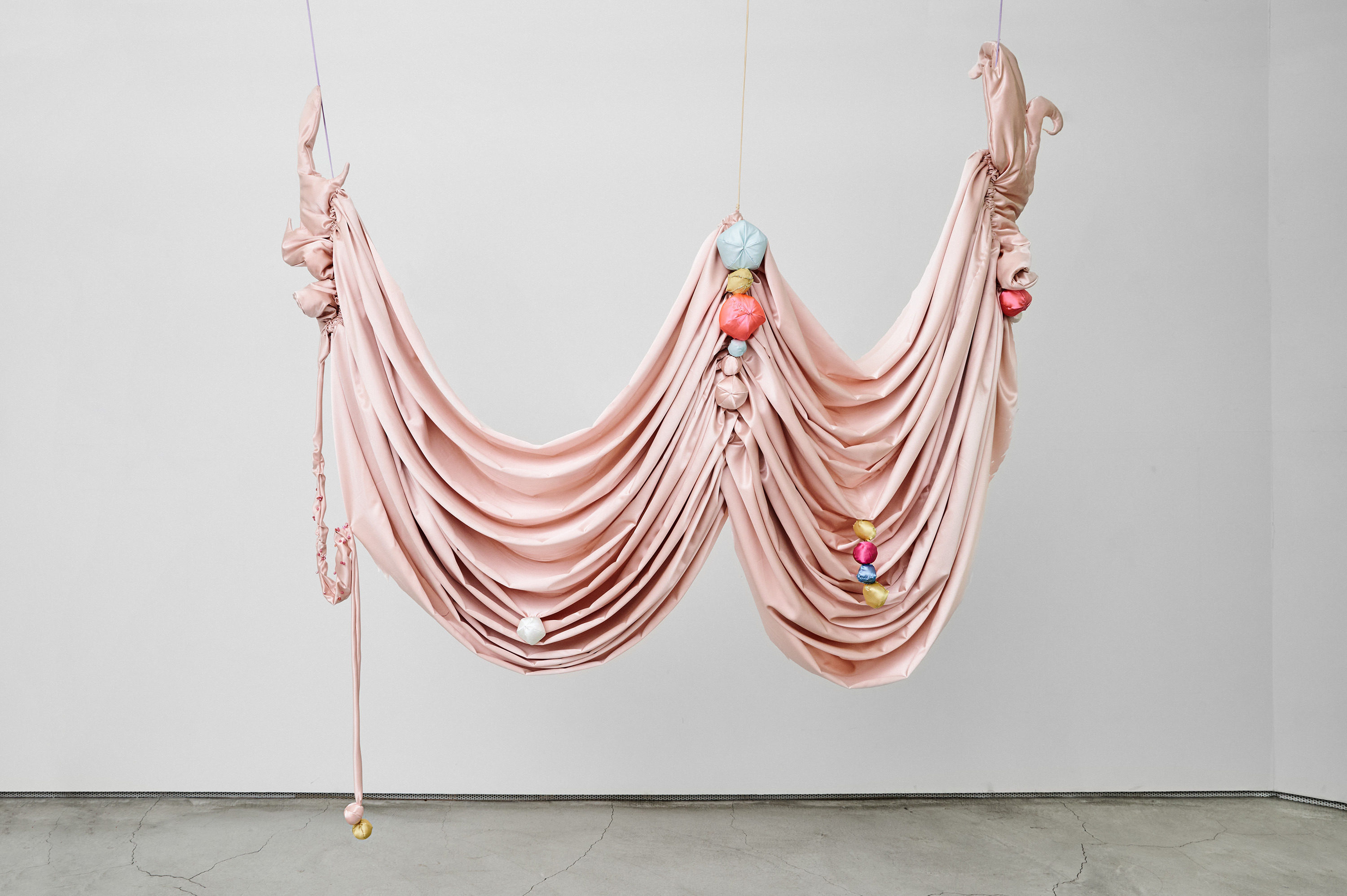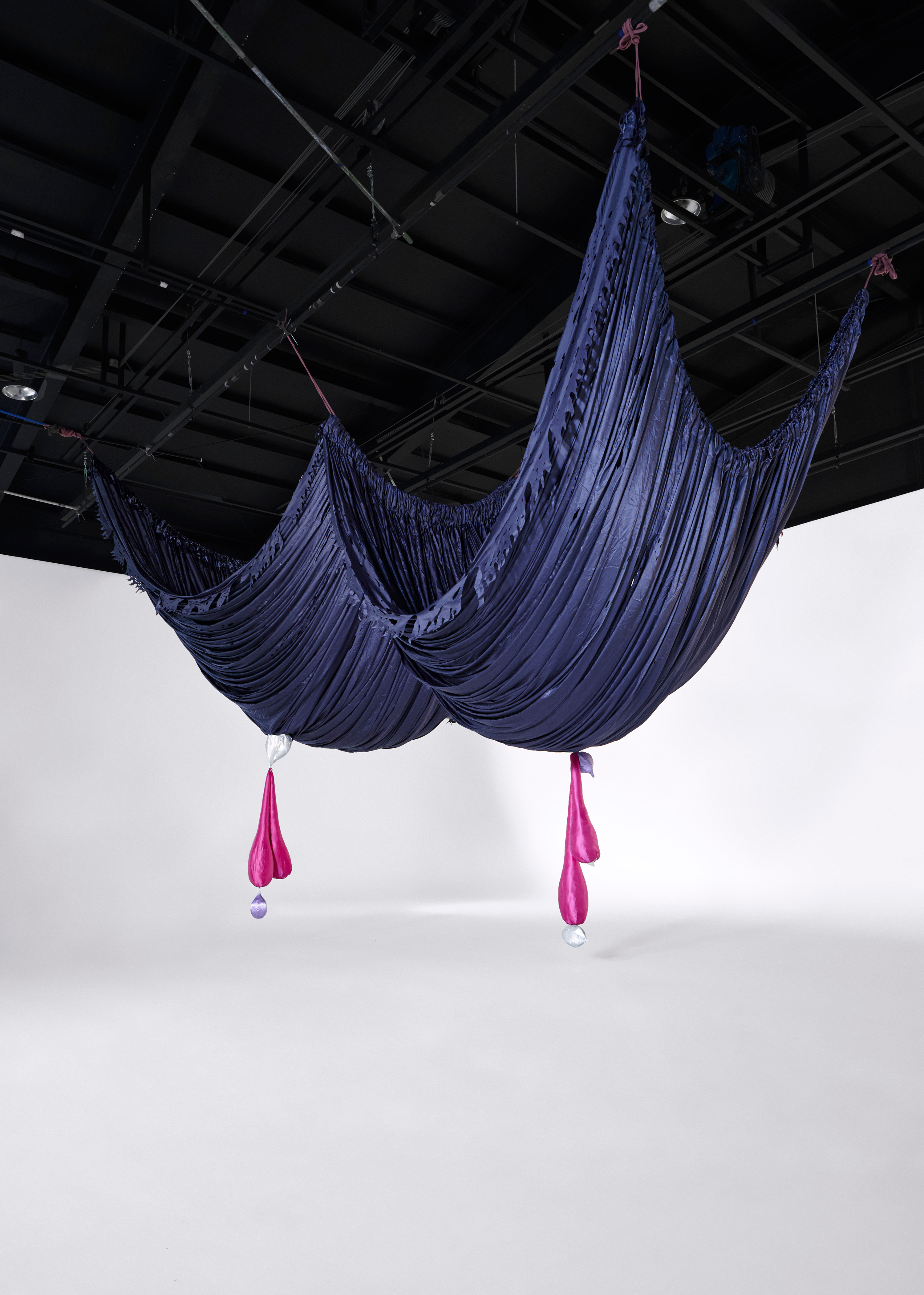 Woo's winning commission, titled The Great Ballroom (2023), is a large-scale installation that continues her series Milk and Honey (2023-ongoing). It serves as a celebratory avenue for vitality and liberation. The installation's draped fabrics accentuate the flexible nature of the fabric and bring to mind the shape of women's breasts.
