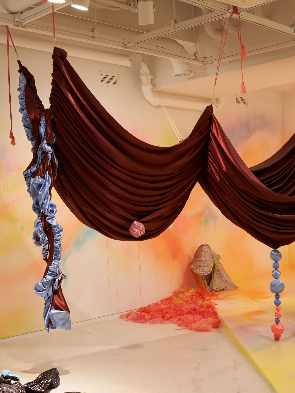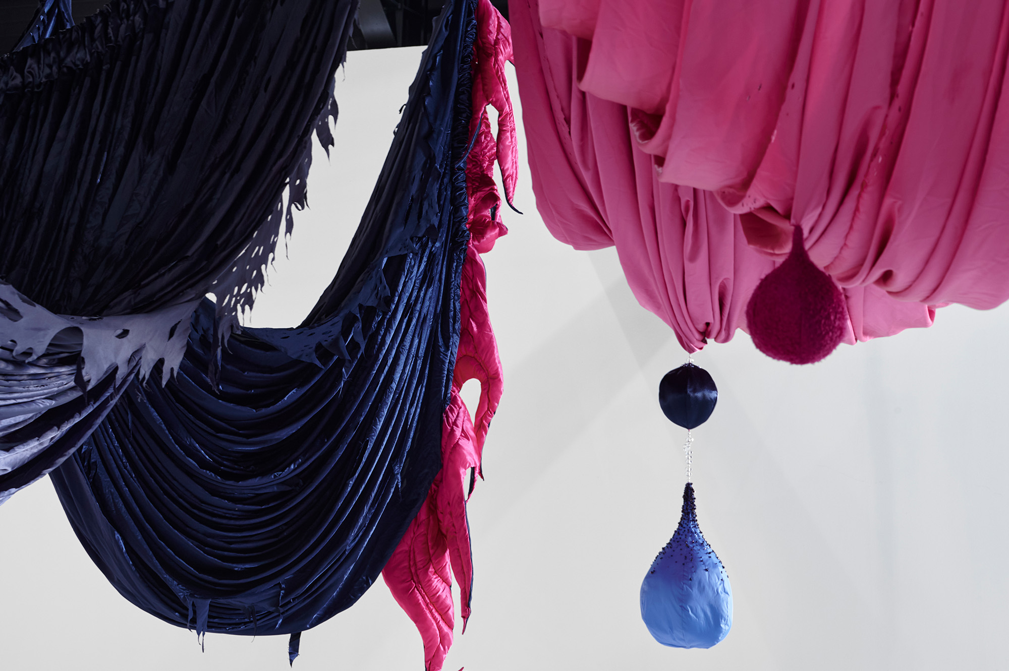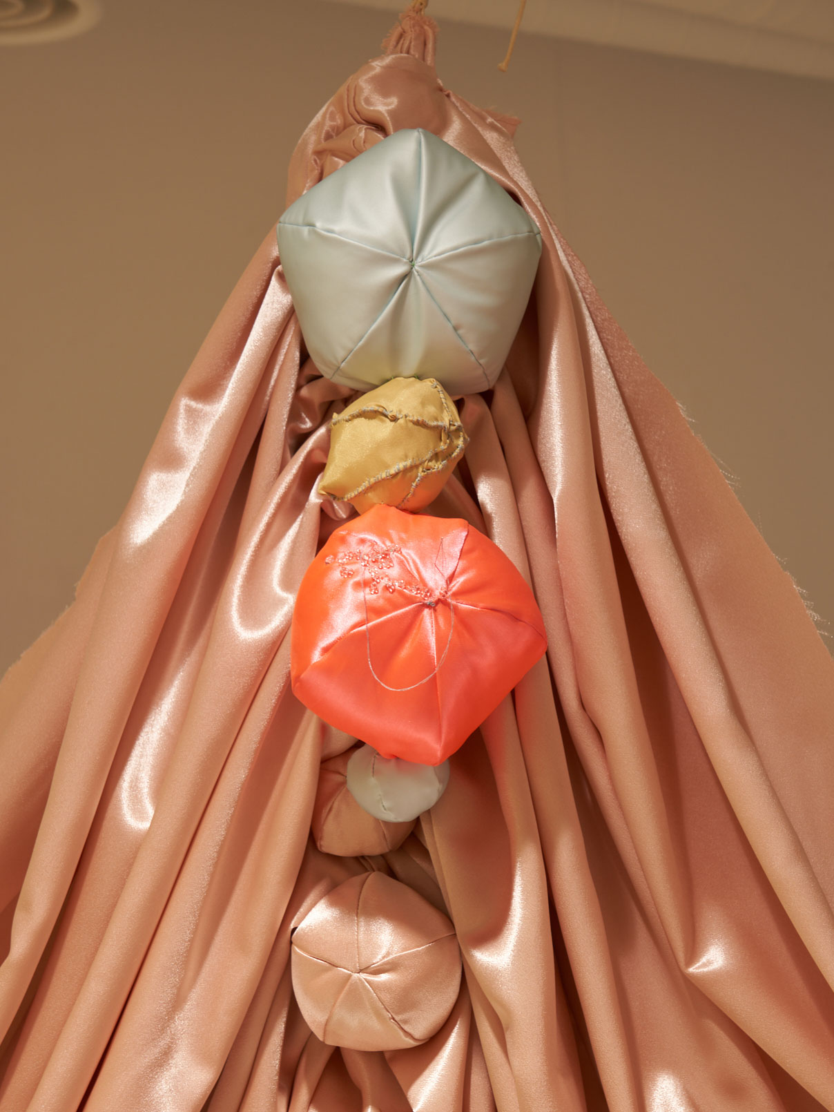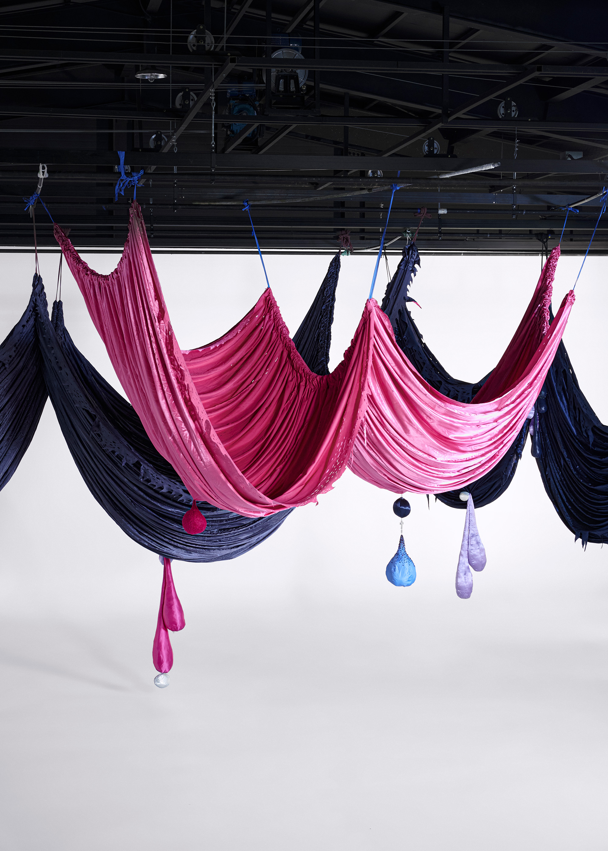 Woo's winning commission, titled The Great Ballroom (2023), is a large-scale installation that continues her series Milk and Honey (2023-ongoing). It serves as a celebratory avenue for vitality and liberation. The installation's draped fabrics accentuate the flexible nature of the fabric and bring to mind the shape of women's breasts.